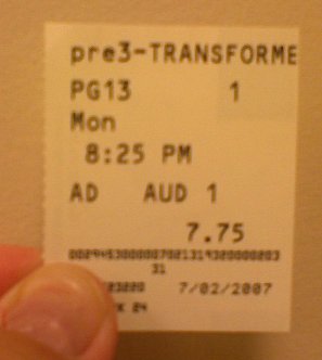 I was surprised, then, when Amy called to say she had tickets for us to see Transformers two days prior to the official release date. She had simply visited the theater’s website with another movie in mind, found the listings for Transformers already up (there were quite a few) and purchased them. Some studios allow theaters do the whole “midnight screening” thing the night before, and there are occasional sneak previews, but this was a bit unusual. Two other people I know saw the movie Monday night, as well. My brother saw it last Friday. I guess because box office numbers drive the industry they may as well get the best figures possible. Besides, doesn’t everyone want to see a sneak preview? Even if it’s a possible Dollar Movie or Rental, aren’t you intrigued by the idea that you are seeing it before you are “supposed” to? Indeed so.
