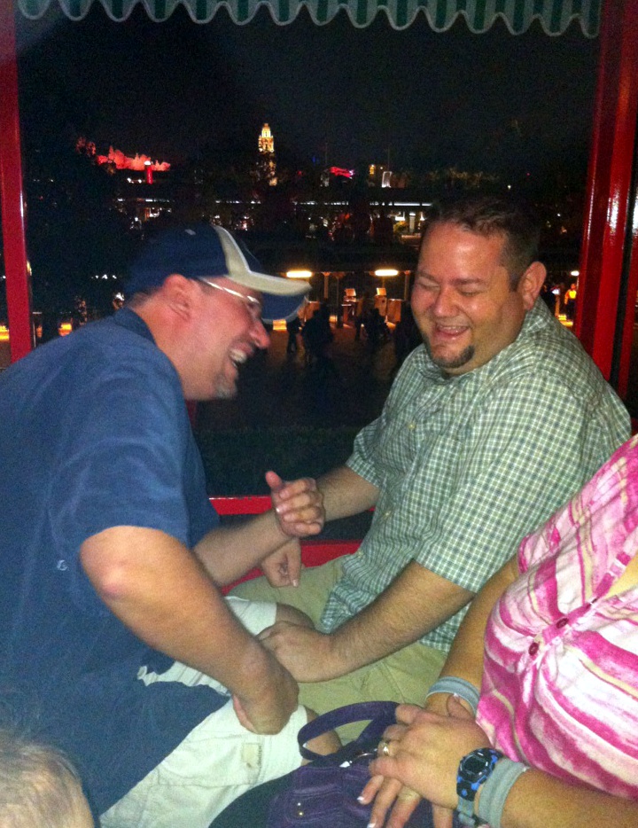 We woke perhaps a bit later than we would have liked (that whole “prodigious sleepers” thing) and freshened up to return to the parks for the evening. Some of the other groups in our travel party had come in, and we began texting plans for the evening. My Mom and Dad were in their room at a nearby hotel, but having driven all day were going to unwind that evening rather than come into the parks. My Grandma was staying with my parents, and would come over when they did. My younger brother, his wife, and their daughter were at the same hotel as my Mom and Dad. My older brother, his wife, and their two kids – also at the same hotel – were on a flight and expected in that evening. At a third hotel, farther down the street, were some close friends of the family.