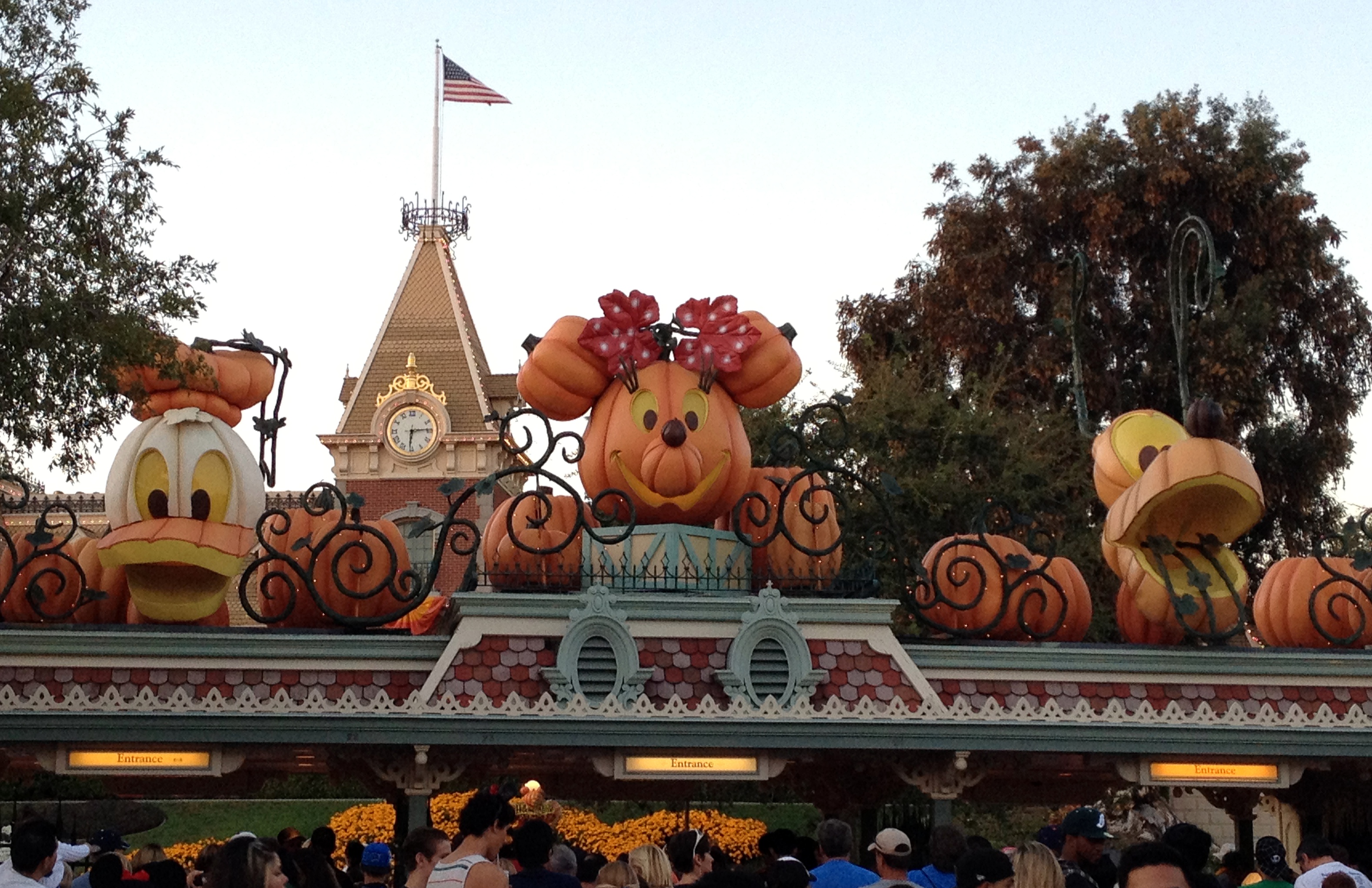 We presented our passes at the front gates near the foot of the Main Street train station, passed through the tunnel of the train berm and, in so doing, were transported to the familiar buildings and reliable atmosphere of Main Street, USA. The first thing I noticed on Main Street, USA – and I have to imagine it was the first thing anyone noticed – was a sixteen-foot-tall Mickey Mouse jack-o’-lantern sitting in the middle of Town Square. We had planned our vacation for during the Halloween holiday season, a time when Disneyland is accented with a modest smattering of jack-o’-lanterns and orange buntings. I should clarify: the decorations are not modest in execution (even an expert in understatement would struggle to describe a sixteen-foot-tall Mickey pumpkin as modest), but rather in scope, particularly compared to the Christmas holiday decorations that replace them in mid-November.