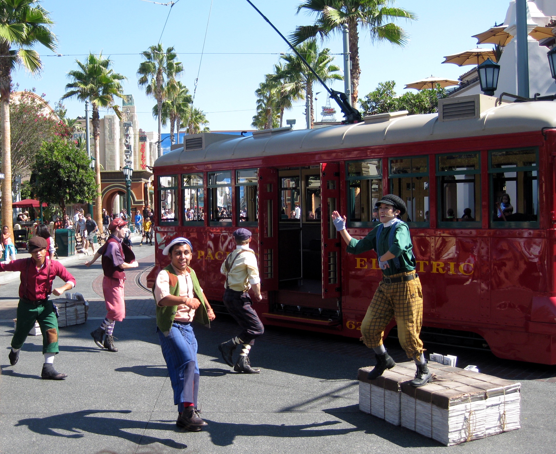 Just inside the gates we stopped, slack-jawed, bug-eyed, looking somehow everywhere at the same time. On the left was a bright red old-fashioned gas station. Period storefronts stretched out parallel in front of us. A reproduction of Los Angeles’ Glendale-Hyperion Bridge spanned the street, and in the moment I was looking at it, the Disneyland Monorail zipped across. On the right was a rock and timber station for the Red Car Trolley, and to complete the absurd perfection of the moment, one of the rail cars was just pulling up. I would not have been surprised to see white doves flying through sun glories in slow motion.