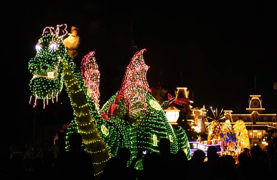 The overall experience of Disney’s Main Street Electrical Parade has not mellowed with age. I have never taken any kind of psychotropic drug, whether recreationally or otherwise, but I imagine the experience is not unlike watching the MSEP. There are complex and bizarre symbols throughout the marching lights, although we tend to look past them because our brains subconsciously discredit paradox to keep our minds from snapping and driving us insane. A short list of things I saw in the parade: angry chess pieces, twinkling princesses, pirate scows, smoking green dragon, spirit coyote, Mayor McCheese.