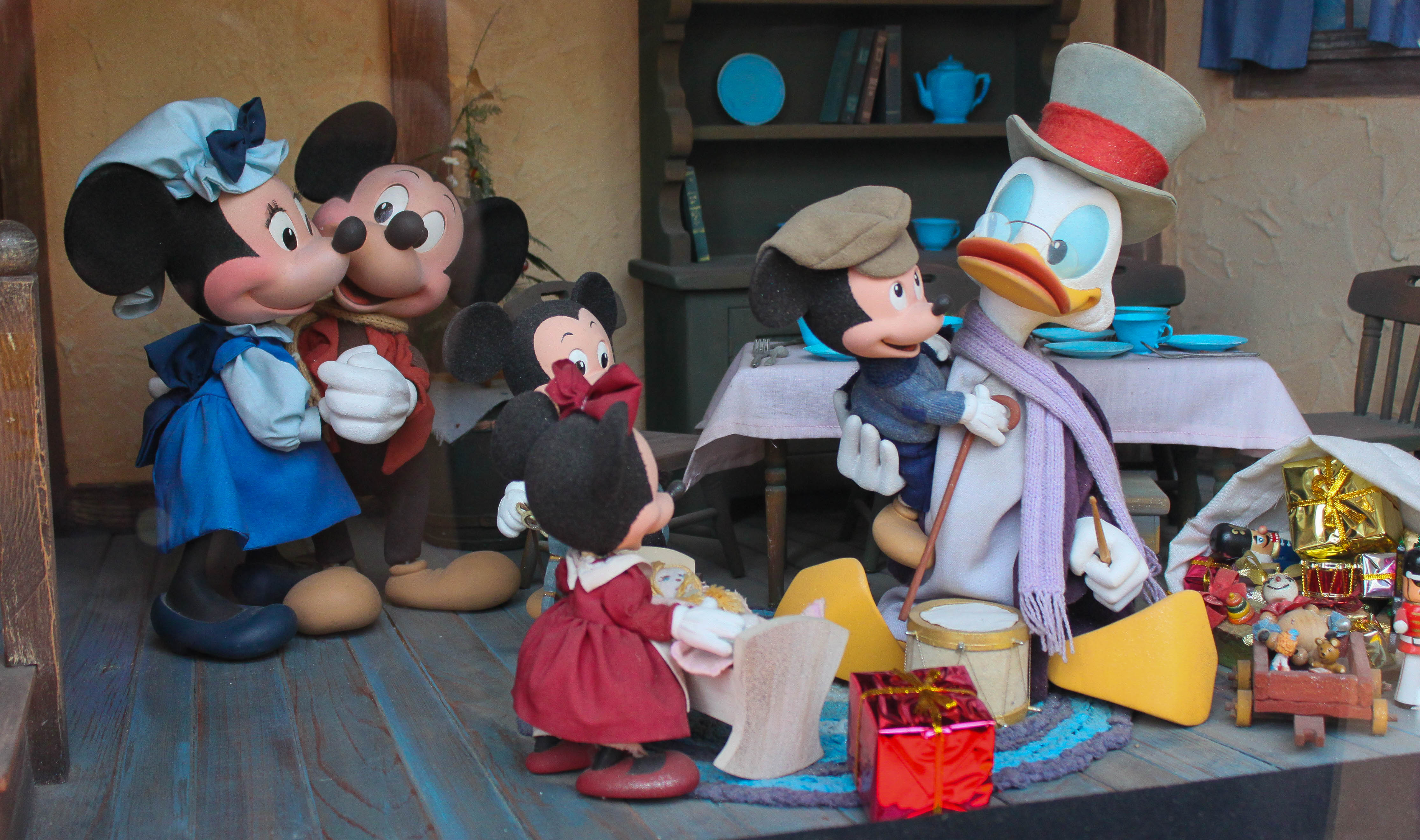 Our group angled from the restrooms toward the Emporium to see the Christmas window displays, which were also a highlight of the seasonal decorations. We stepped up to the first window of the Emporium and I found myself looking into Scrooge’s Counting House from “Mickey’s Christmas Carol.” A miniature Scrooge stood behind a desk full of tiny gold coins, peering peevishly over his glasses at Donald bearing a Christmas wreath.